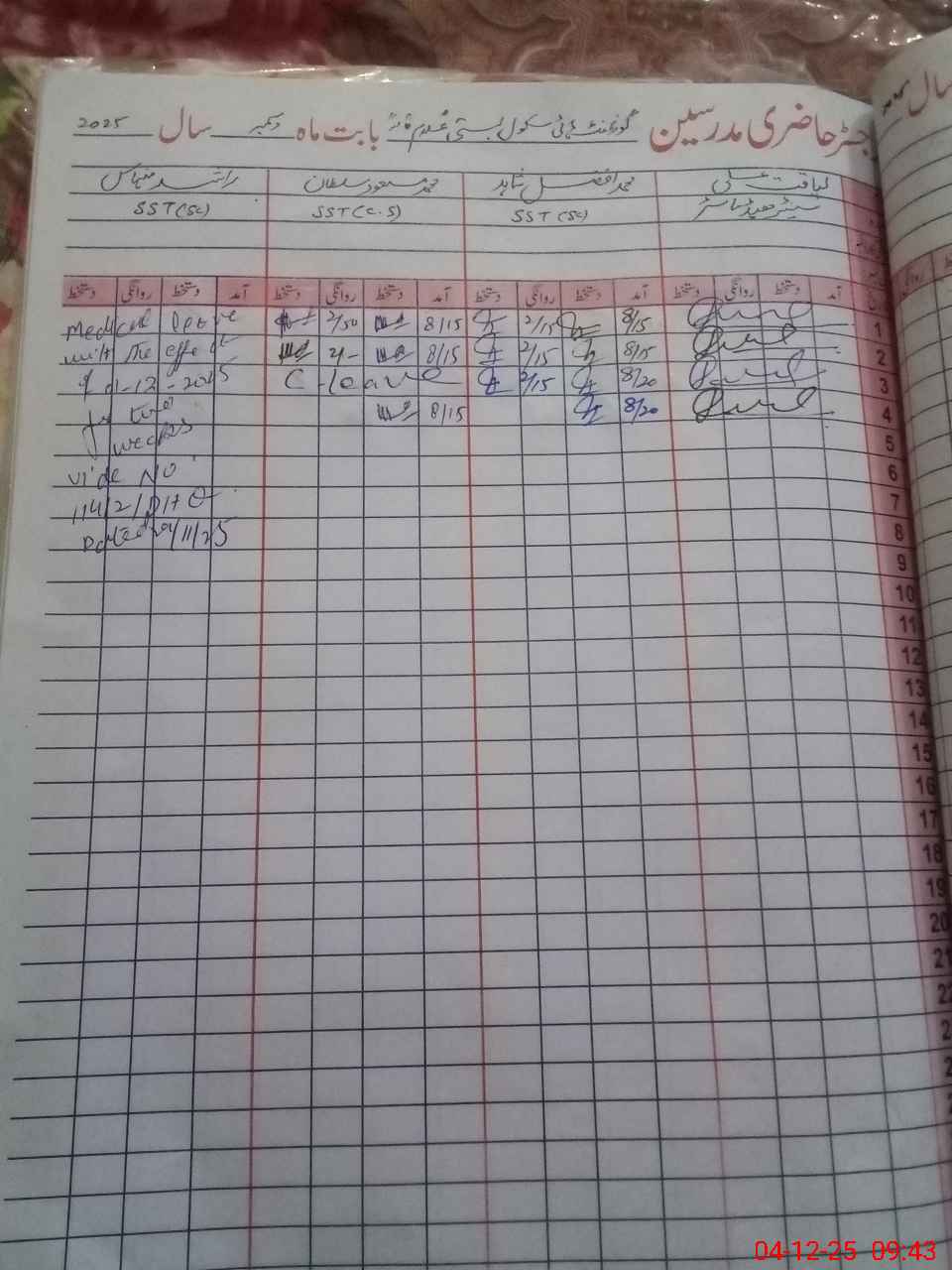 | CNIC | Full Name | Designation | R/C | Absence During Last Calender Month |