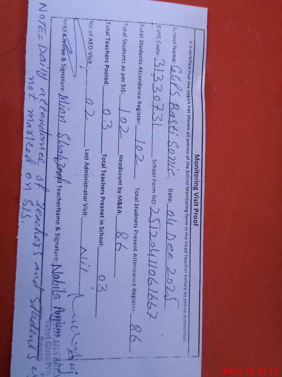 | Attendance Register | Head Teacher | MEA with School | Visit Proof |