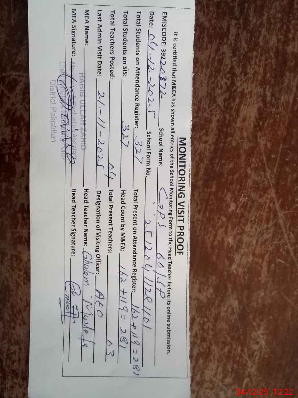 | Remarks (Use Separate Page if Required): note STI PST MUHAMMAD AJMAL FOUND PRESENT CNIC 3640133905385 STI PST MUHAMMAD FARMAN LIAQAT CNIC 3640123781553 FOUND PRESENT AT TIME OF SCHOOL INSPECTION | |||||