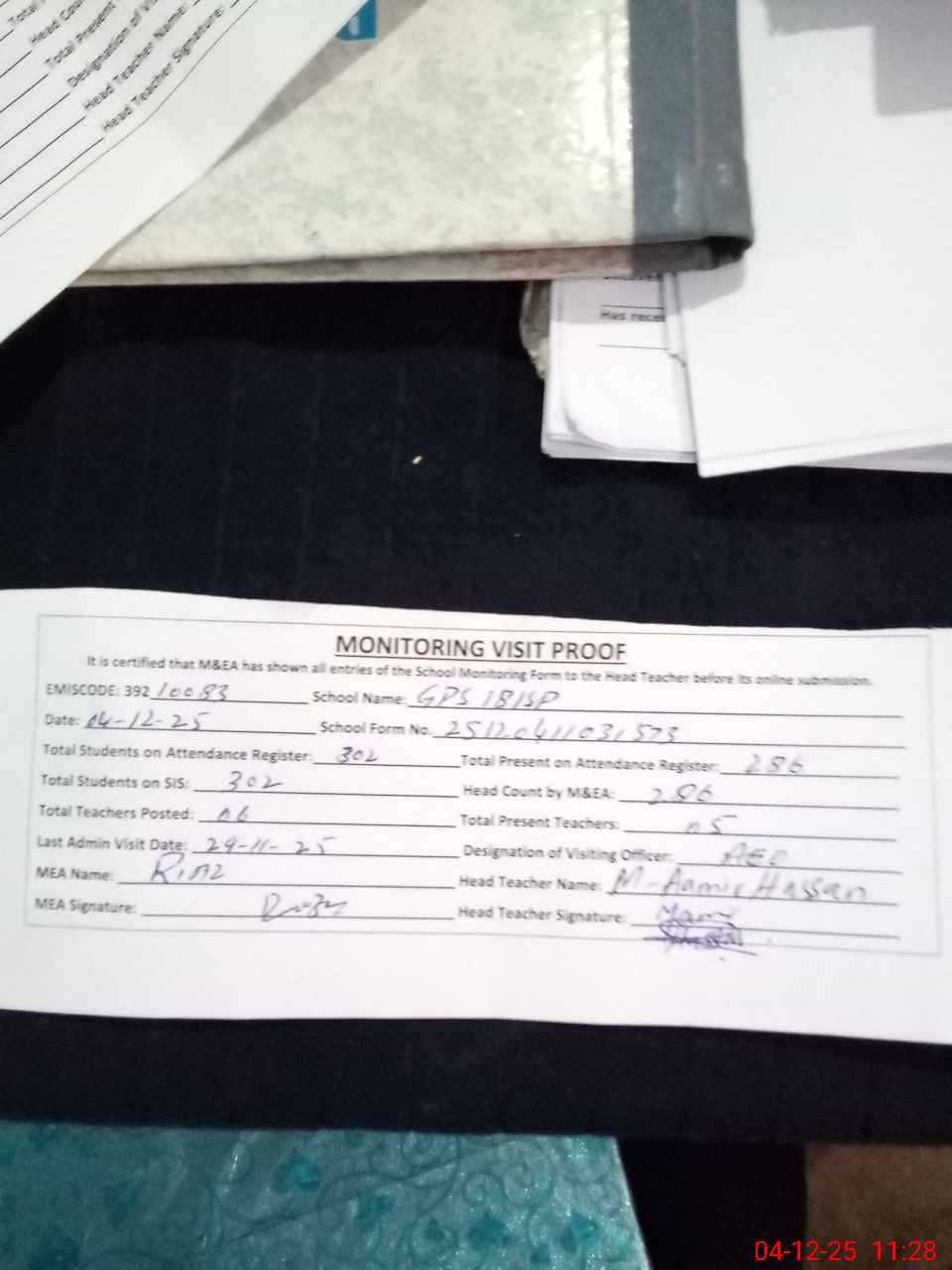 | Attendance Register | Head Teacher | MEA with School | Visit Proof |