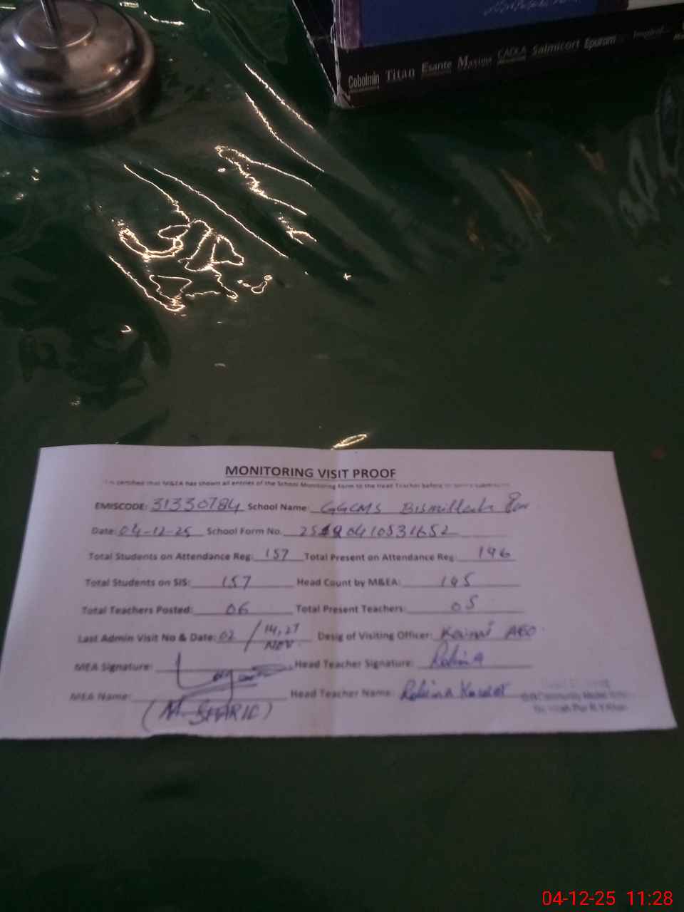 | Attendance Register | Head Teacher | MEA with School | Visit Proof |