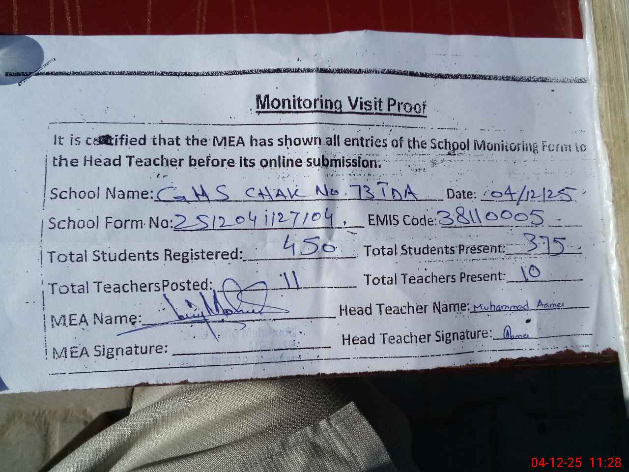 | EMIS Code: 38110005 | Name of School: GHS CHAK NO 73 TDA | |||