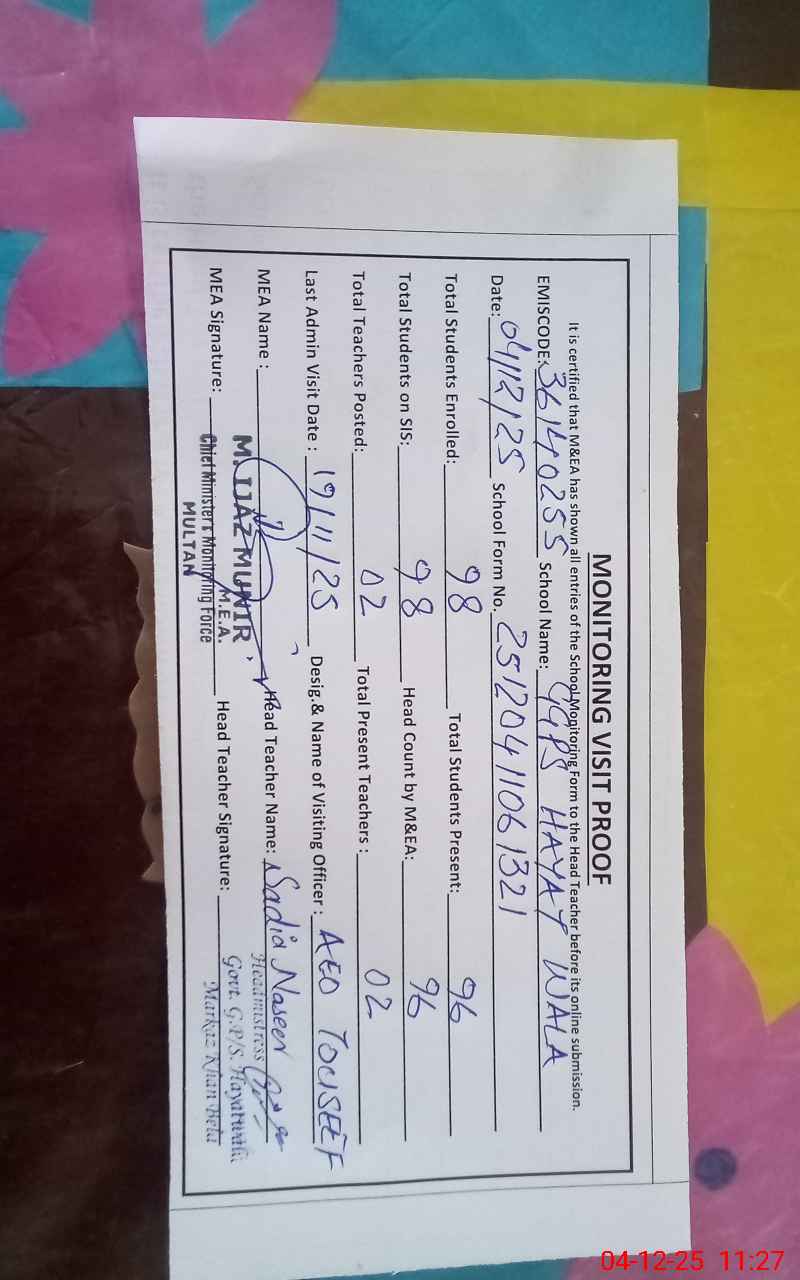 | EMIS Code: 36140255 | Name of School: GGPS HAYAT WALA | |||