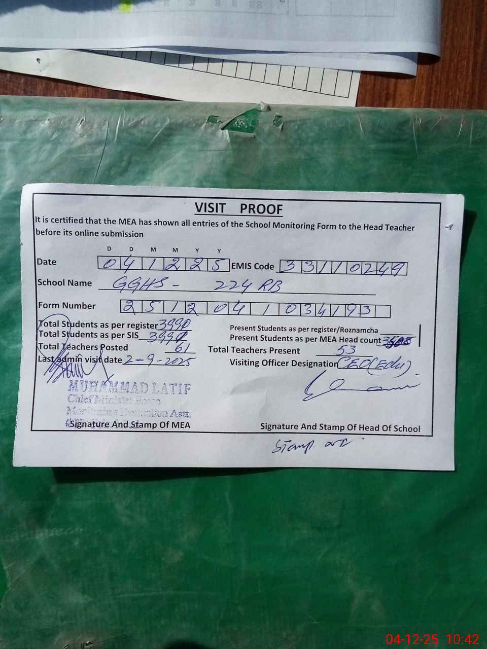 | EMIS Code: 33110249 | Name of School: GGHS CHAK NO 224 RB WAZIR KHAN | |||