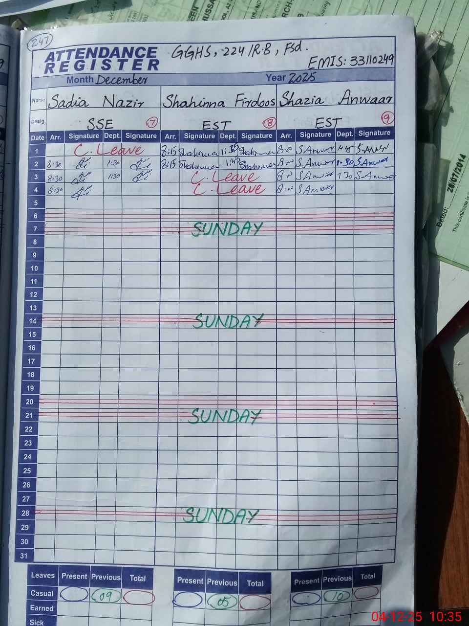 | Remarks (Use Separate Page if Required): NSB funds record not provided. Today dt 04 December students attendance not maintained | |||||