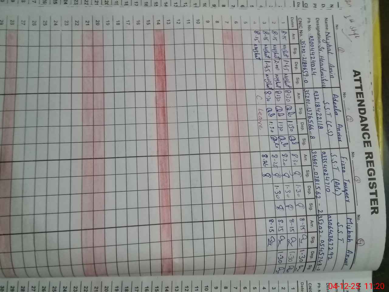 | CNIC | Full Name | Designation | R/C | Absence During Last Calender Month |