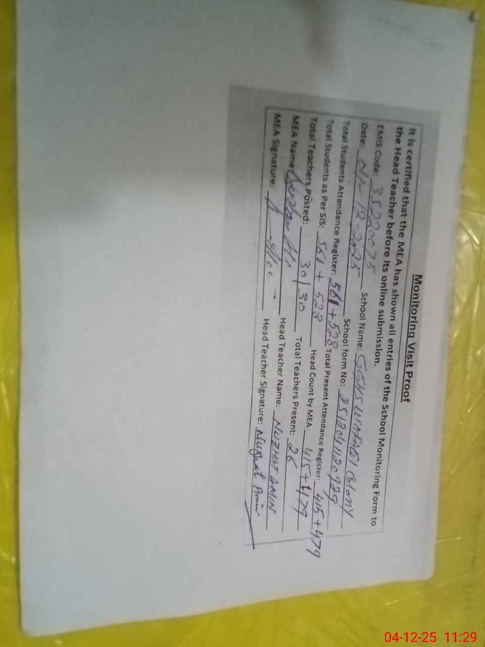 | Attendance Register | Head Teacher | MEA with School | Visit Proof |