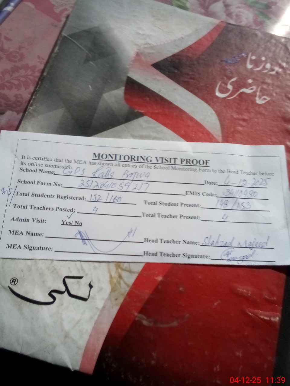| Attendance Register | Head Teacher | MEA with School | Visit Proof |