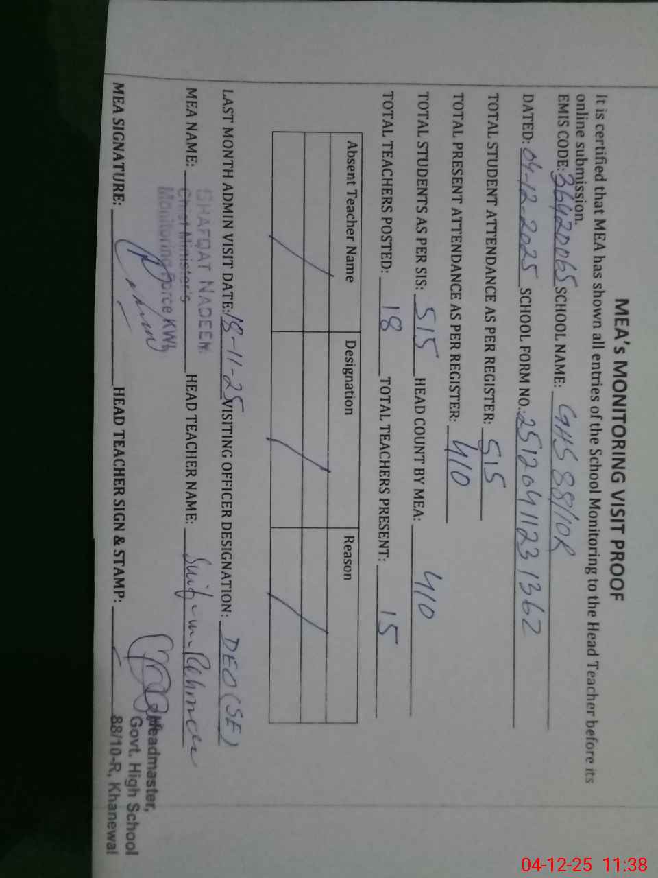 | EMIS Code: 36420065 | Name of School: GHS 88/10-R, KHANEWAL | |||