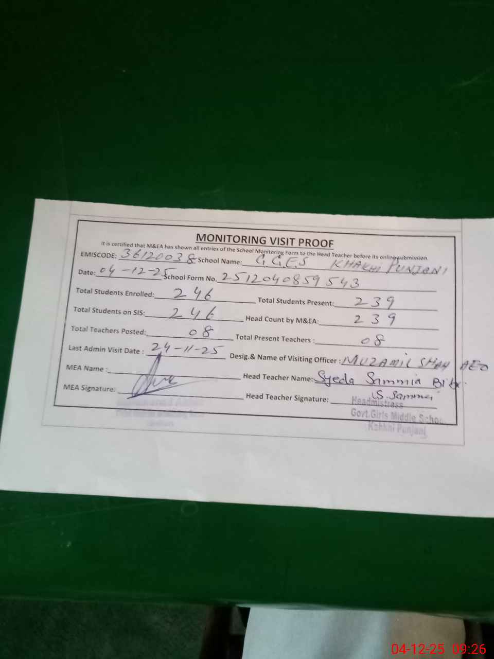 | Attendance Register | Head Teacher | MEA with School | Visit Proof |