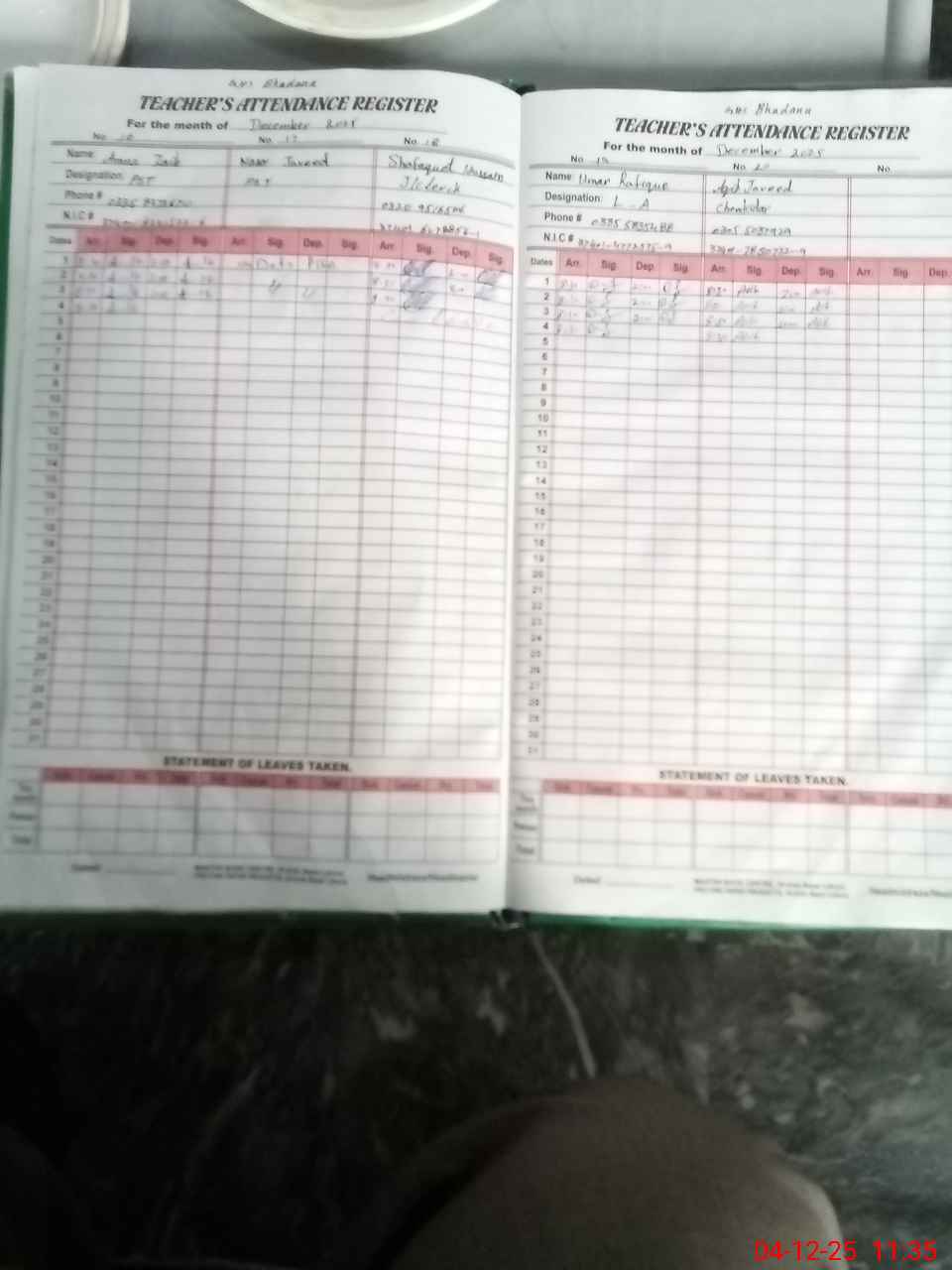 | CNIC | Full Name | Designation | R/C | Absence During Last Calender Month |