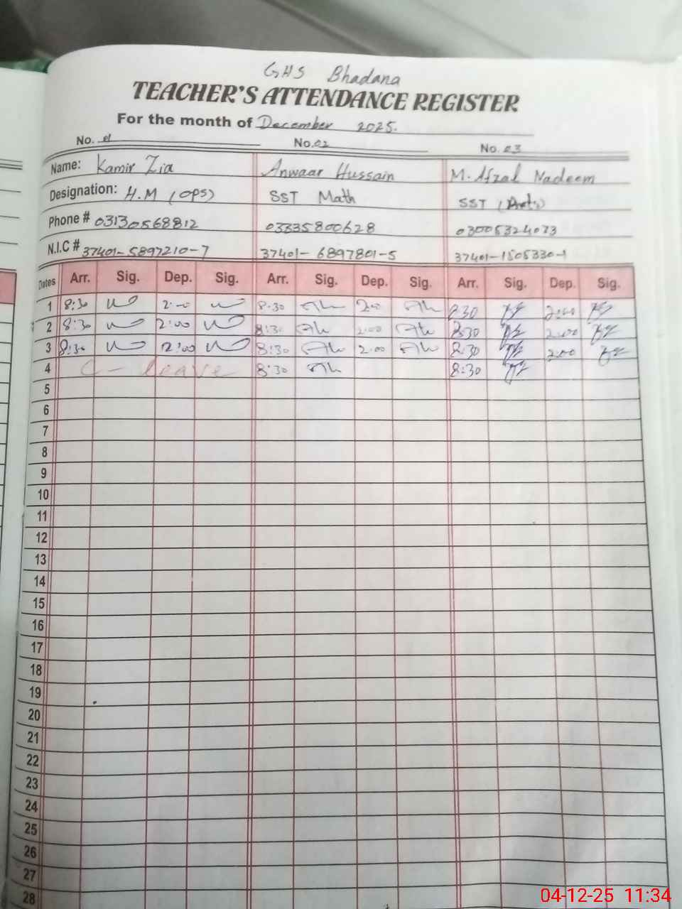 | CNIC | Full Name | Designation | R/C | Absence during last cal. month |