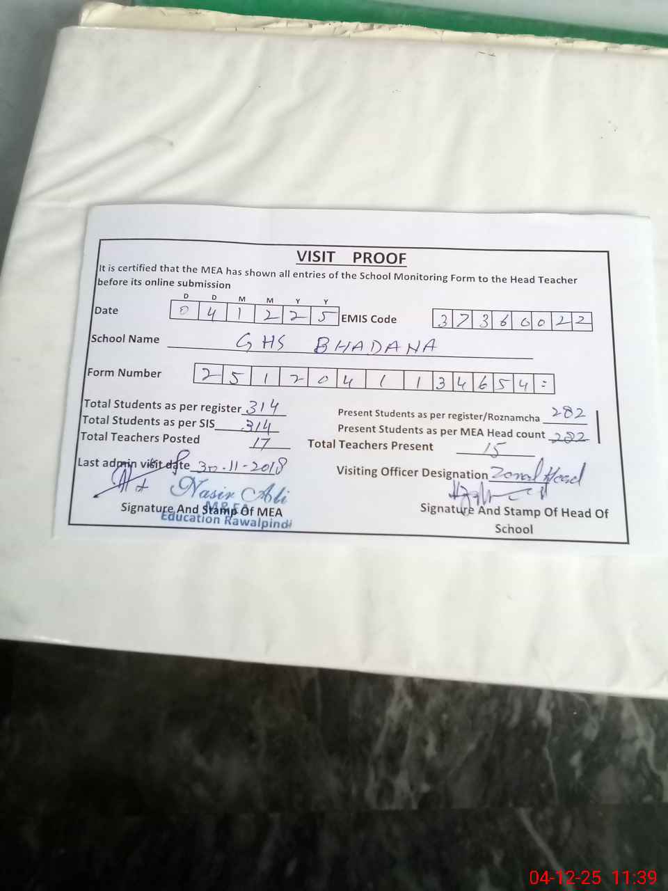 | Attendance Register | Head Teacher | MEA with School | Visit Proof |
