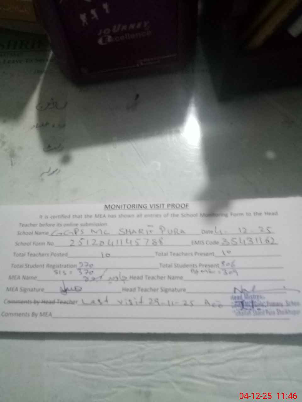 | Attendance Register | Head Teacher | MEA with School | Visit Proof |