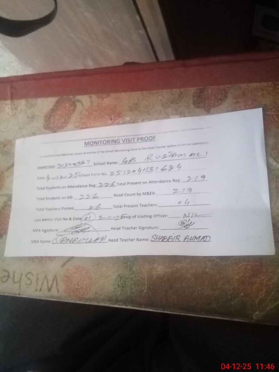 | Attendance Register | Head Teacher | MEA with School | Visit Proof |