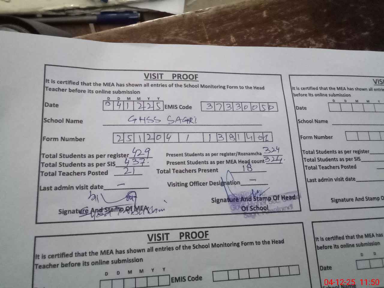 | Attendance Register | Head Teacher | MEA with School | Visit Proof |