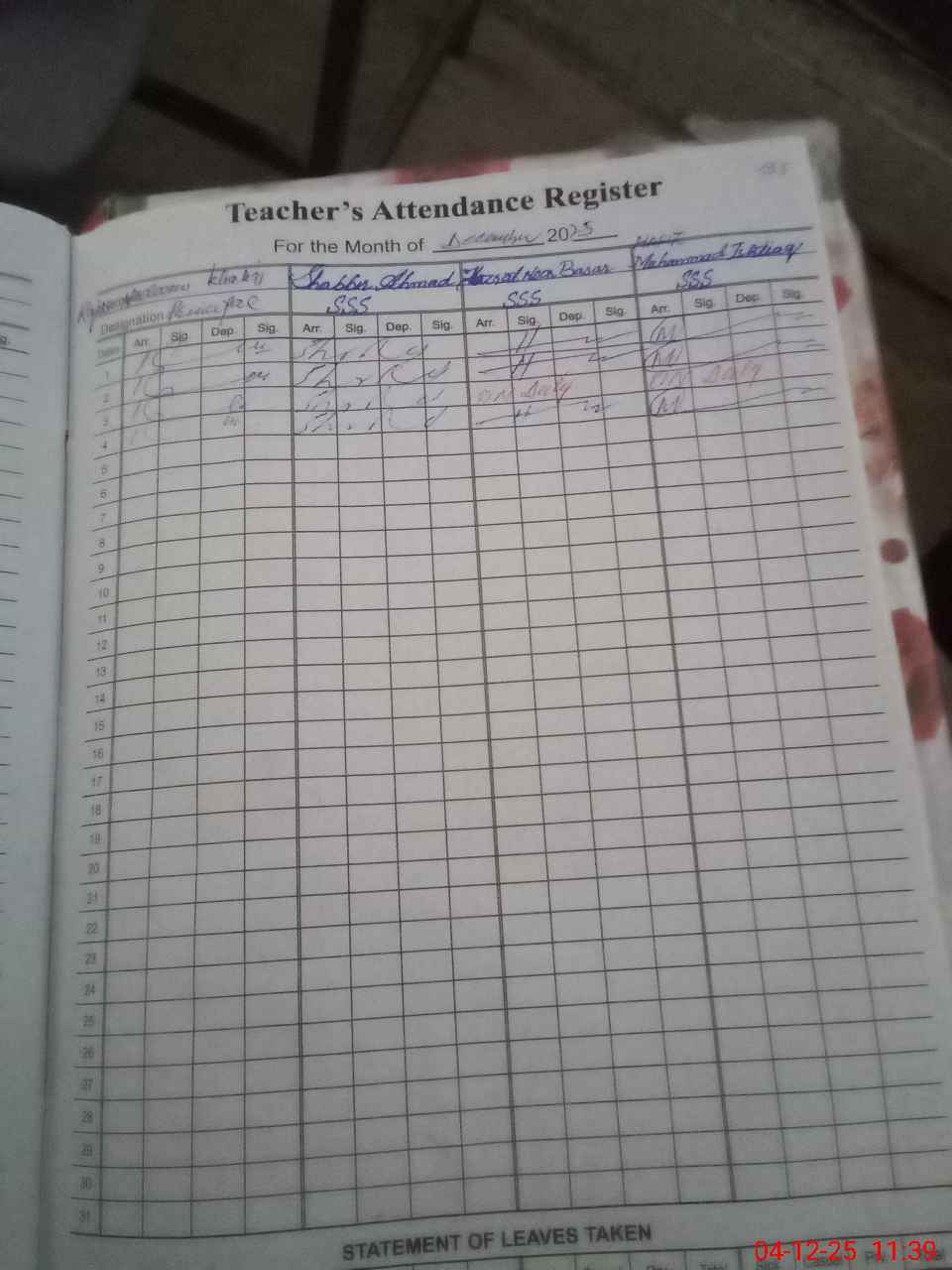 | CNIC | Full Name | Designation | R/C | Absence During Last Calender Month |