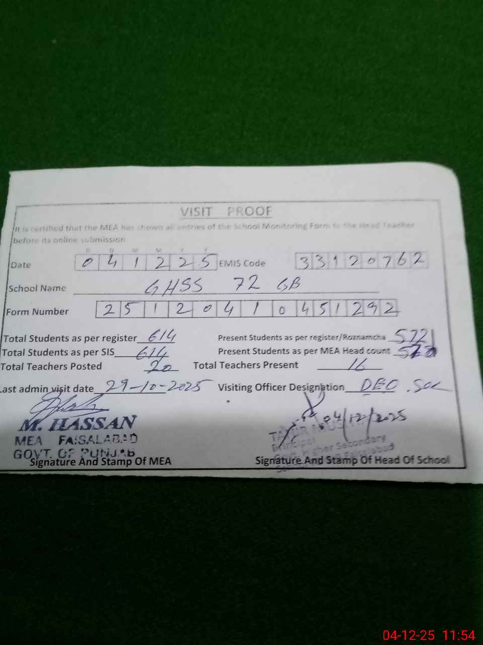 | Attendance Register | Head Teacher | MEA with School | Visit Proof |