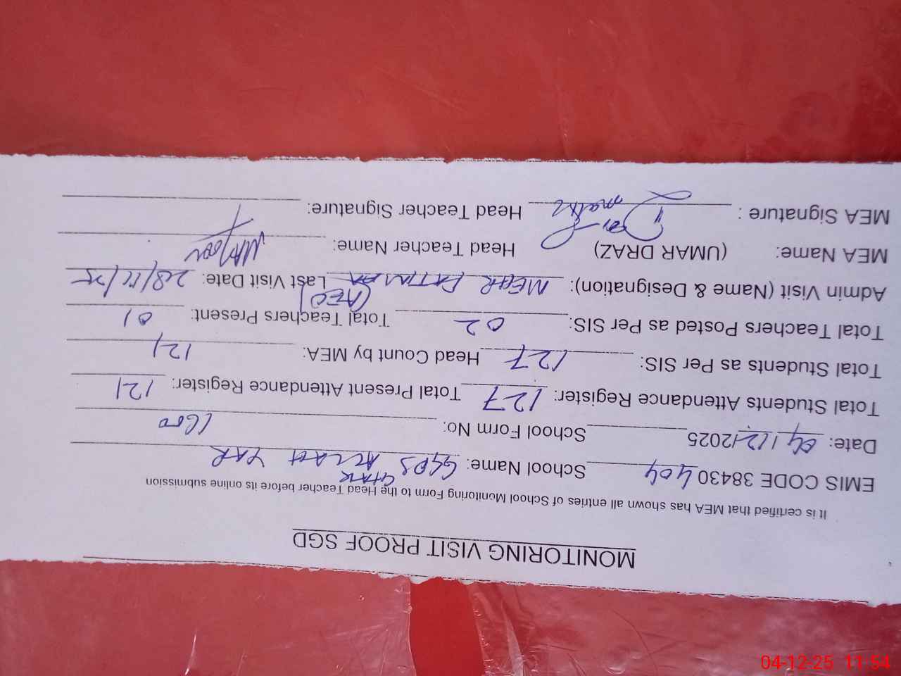 | Attendance Register | Head Teacher | MEA with School | Visit Proof |