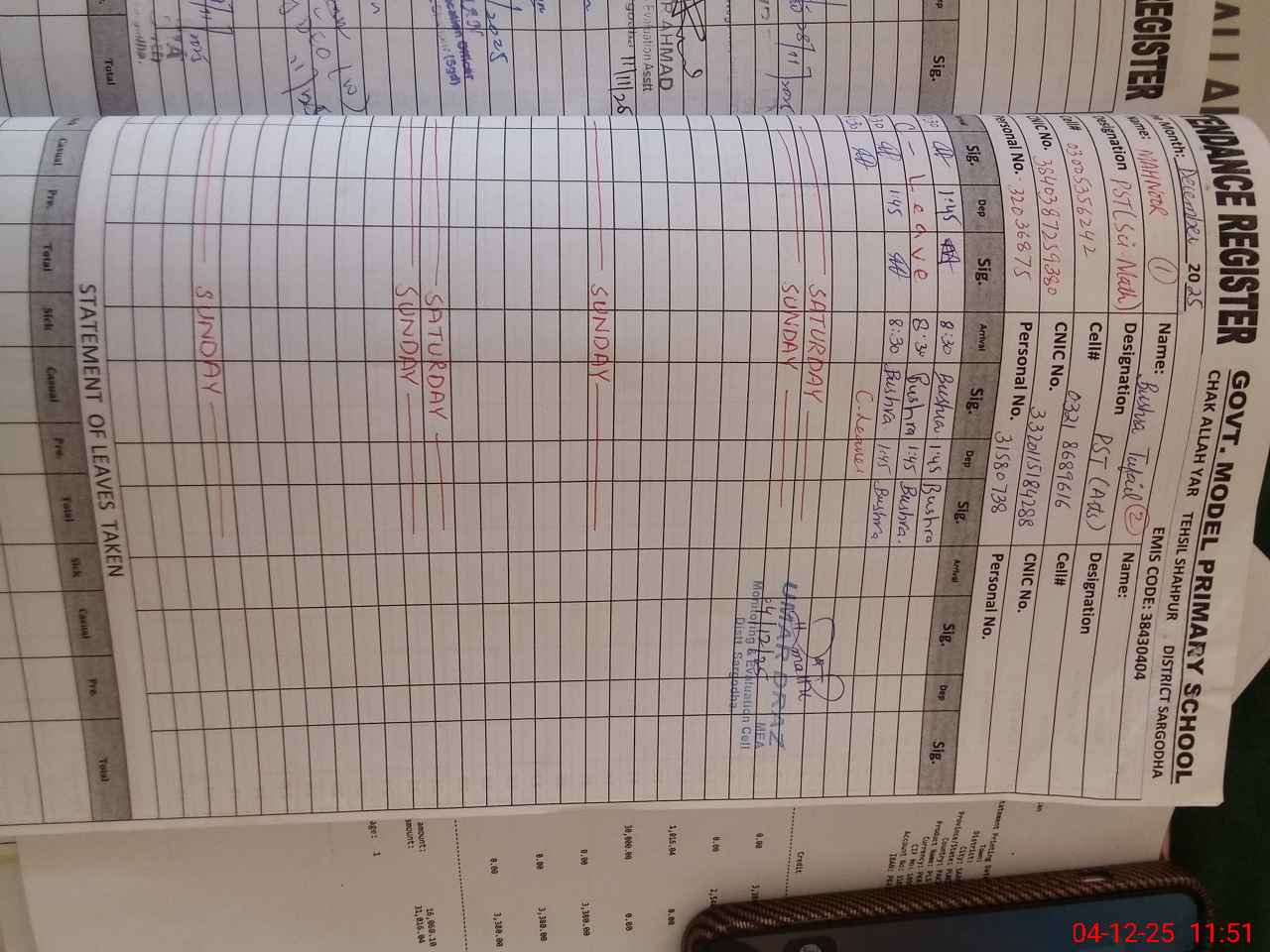 | CNIC | Full Name | Designation | R/C | Absence During Last Calender Month |