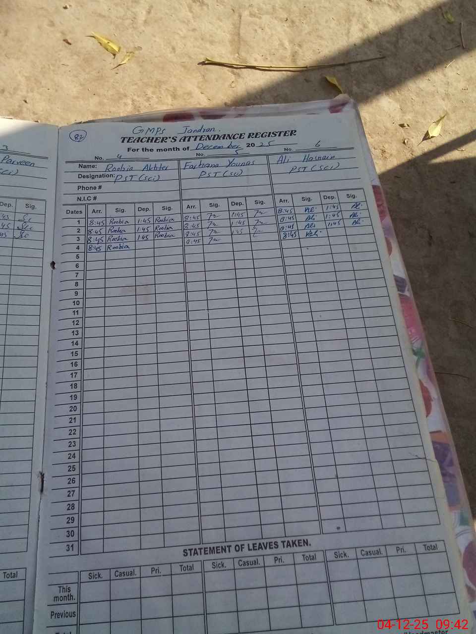 | Remarks (Use Separate Page if Required): DEO detailed Mr Ali as head of school but he refused to take this responsibility no one is available to give record of school Teacher attendance and students attendance taken by own it's not as per SIS one teacher on leave,that is sanctioned by MDM Ferhana younas | |||||