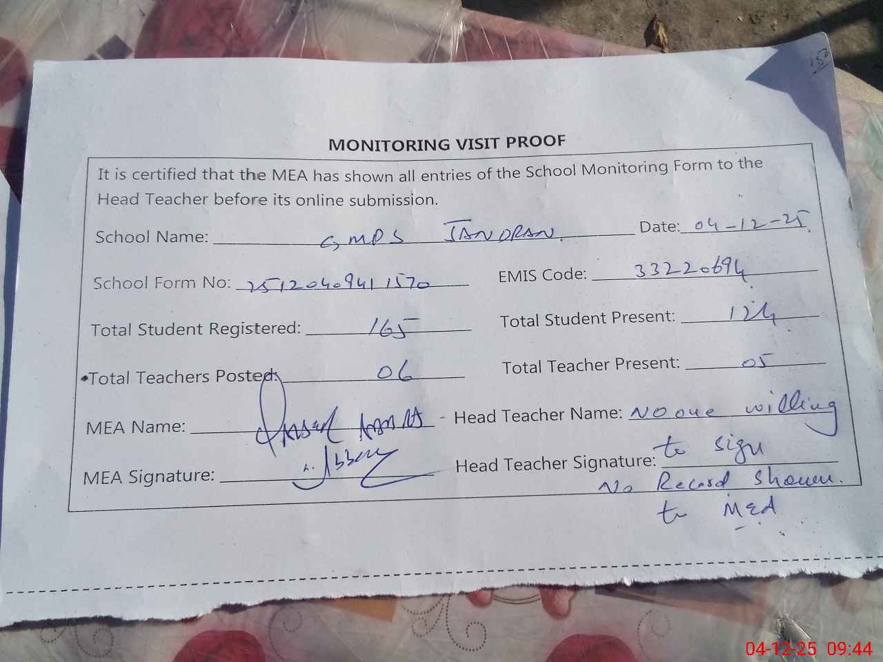 | Attendance Register | Head Teacher | MEA with School | Visit Proof |