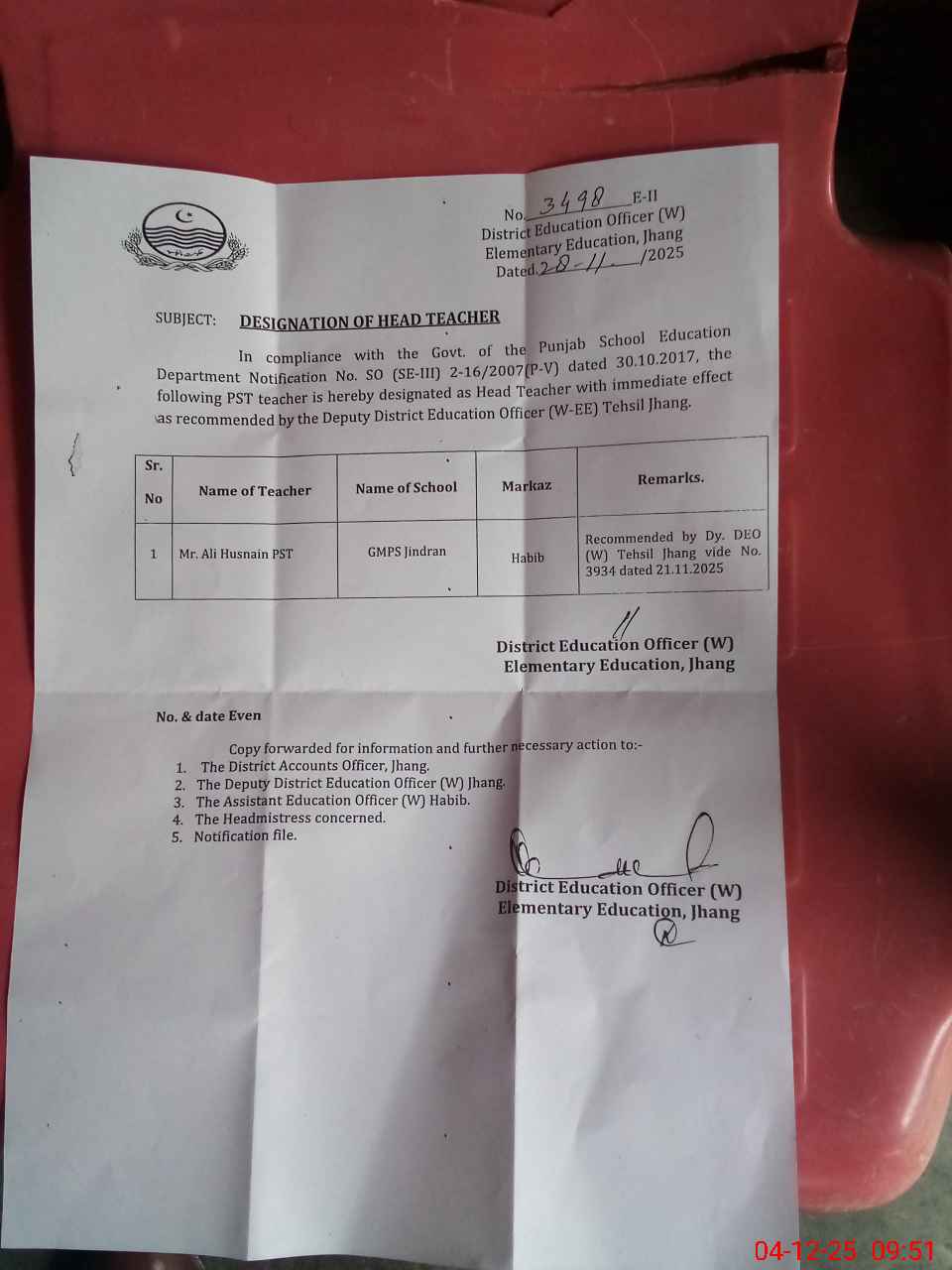 | District: JHANG | Tehsil: JHANG | Markaz: HABIB - FEMALE | Level: Primary | |