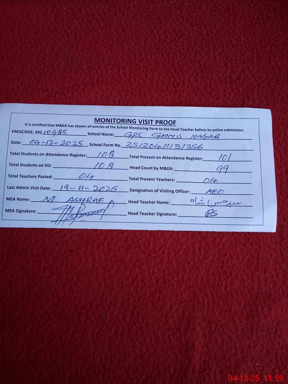 | Attendance Register | Head Teacher | MEA with School | Visit Proof |