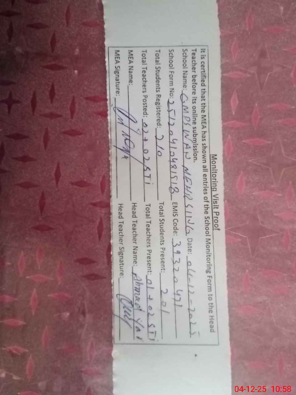 | Attendance Register | Head Teacher | MEA with School | Visit Proof |