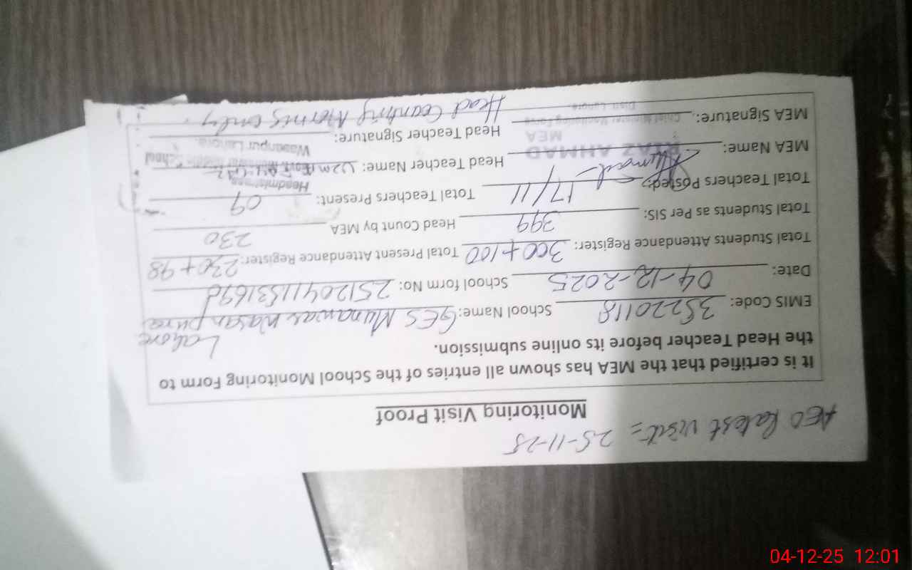 | Attendance Register | Head Teacher | MEA with School | Visit Proof |