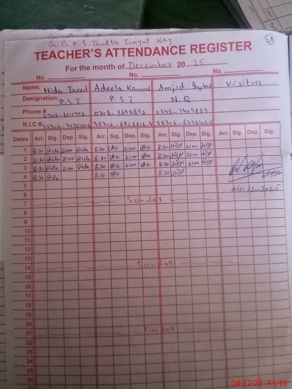 | CNIC | Full Name | Designation | R/C | Absence During Last Calender Month |