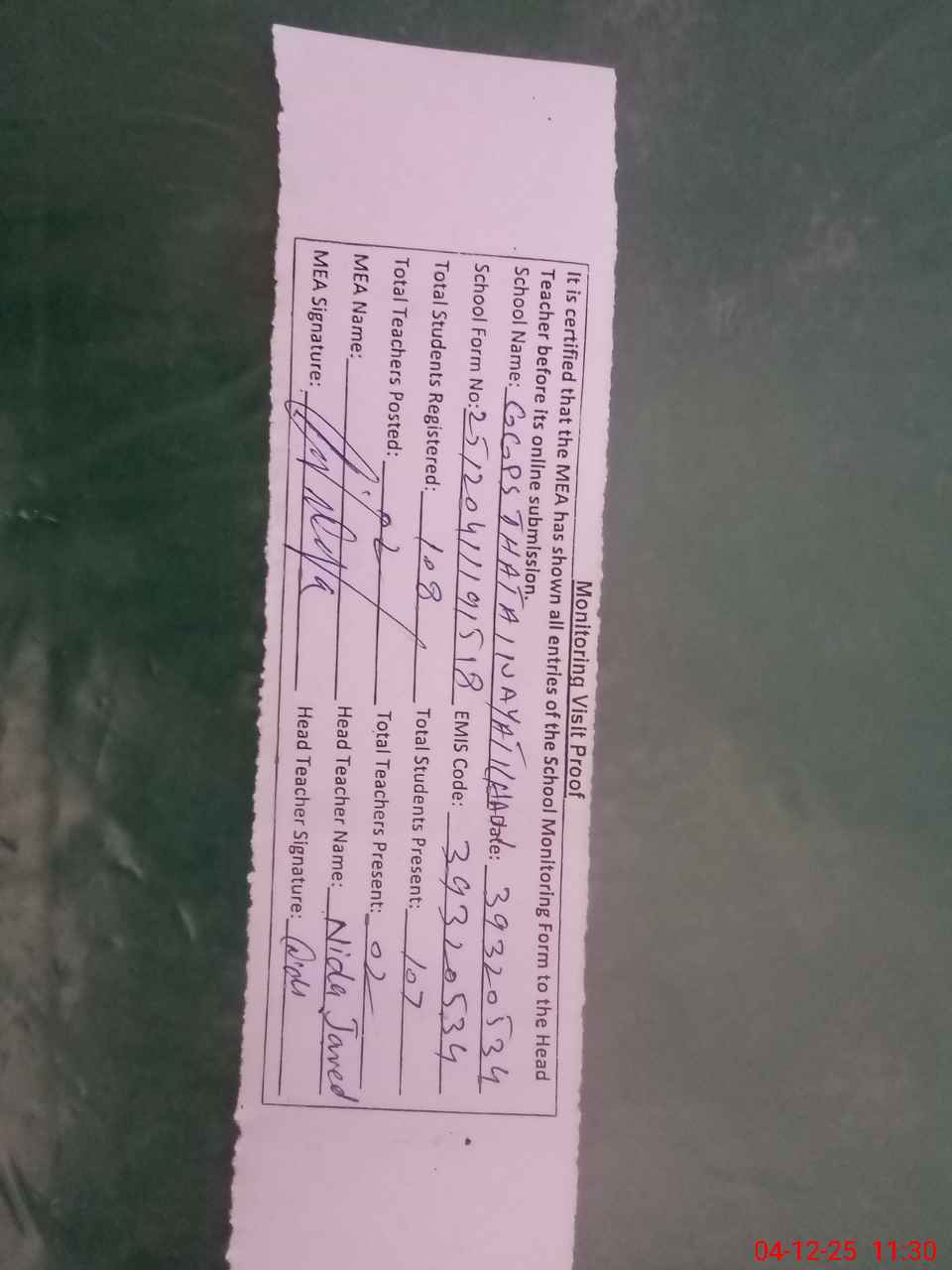 | Attendance Register | Head Teacher | MEA with School | Visit Proof |