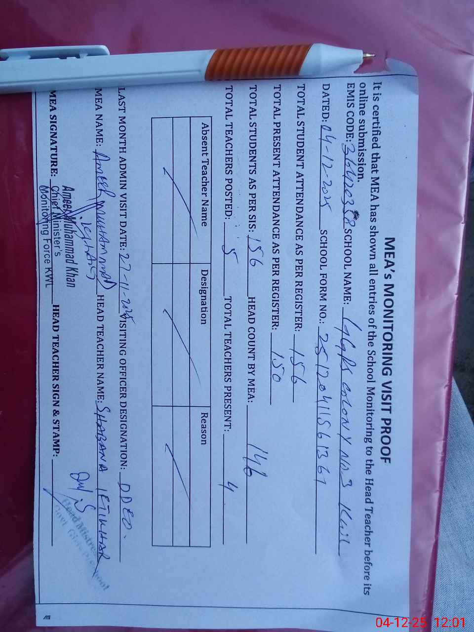| Attendance Register | Head Teacher | MEA with School | Visit Proof |