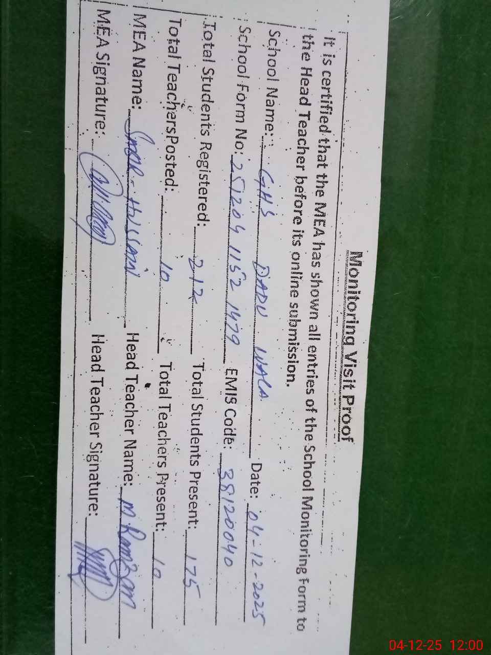 | EMIS Code: 38120040 | Name of School: GHS DADU WALA | |||