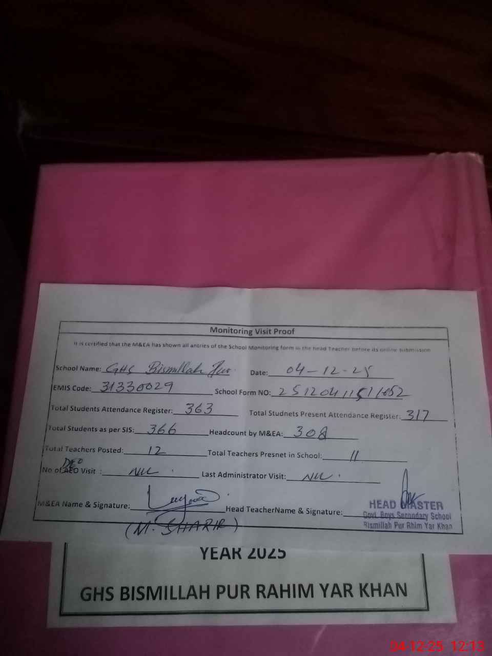 | EMIS Code: 31330029 | Name of School: GHS BISMILLAH PUR | |||