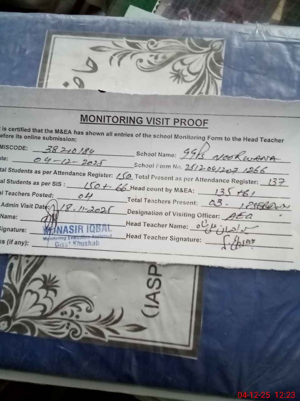 | Attendance Register | Head Teacher | MEA with School | Visit Proof |