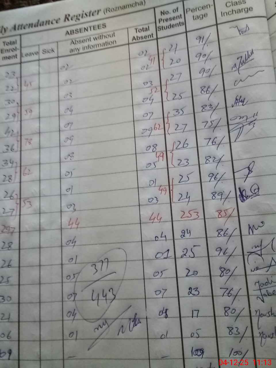| No. of Students Present - Male | 0 | 10 | 17 | 23 | 20 | 25 | 24 | 49 | 49 | 62 | 52 | 41 | 377 | |||