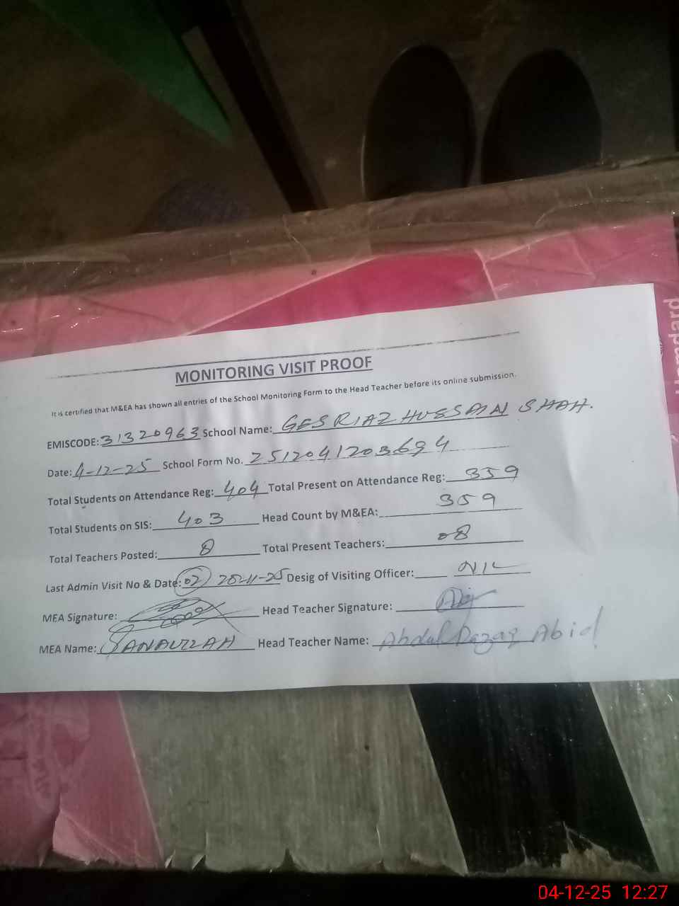| Attendance Register | Head Teacher | MEA with School | Visit Proof |