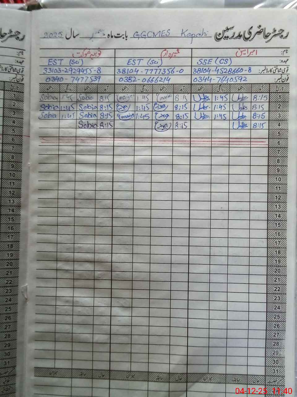 | CNIC | Full Name | Designation | R/C | Absence During Last Calender Month |