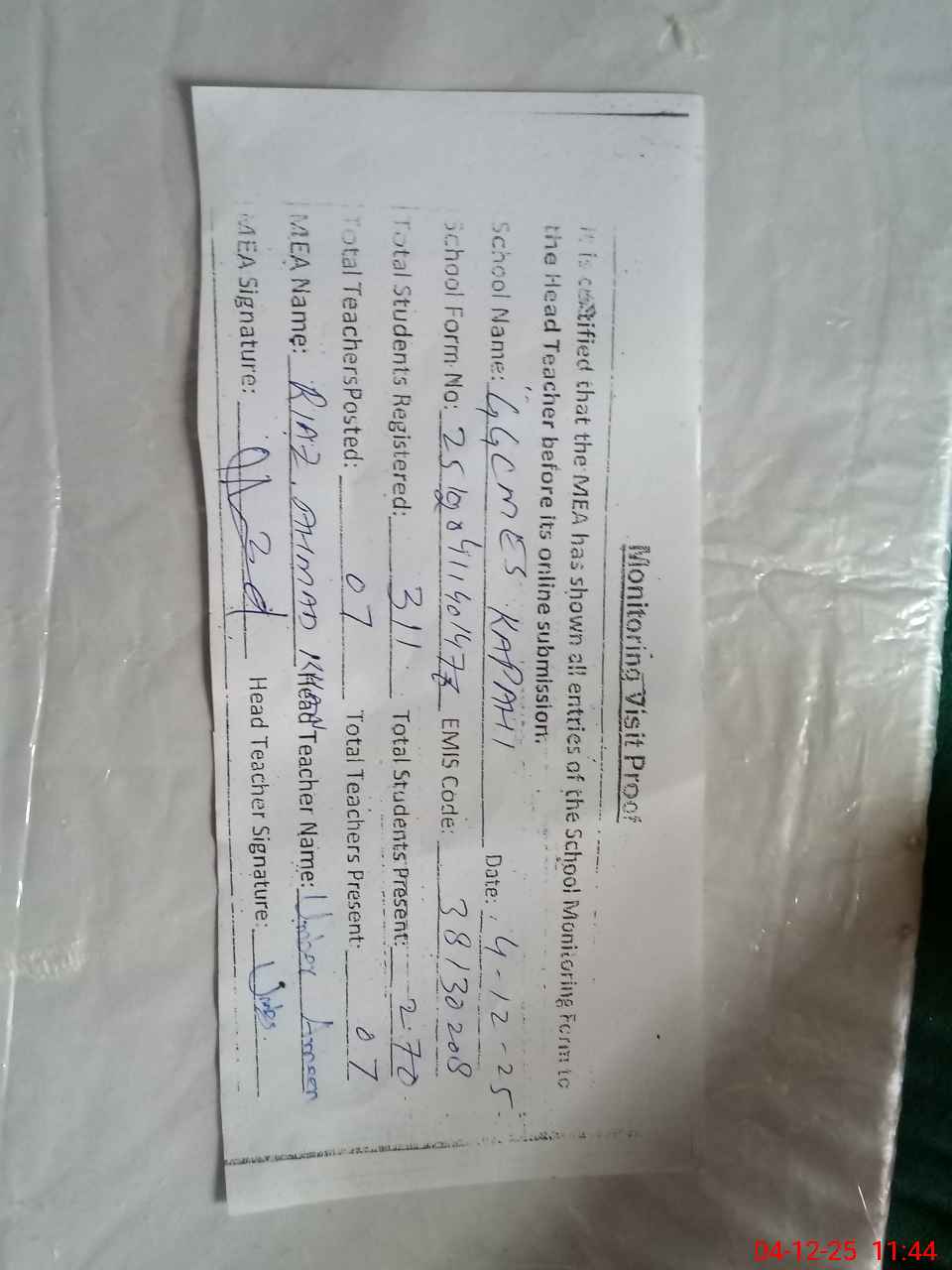 | Attendance Register | Head Teacher | MEA with School | Visit Proof |