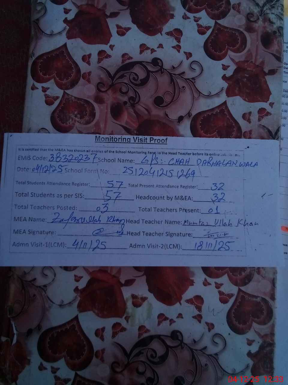 | Attendance Register | Head Teacher | MEA with School | Visit Proof |