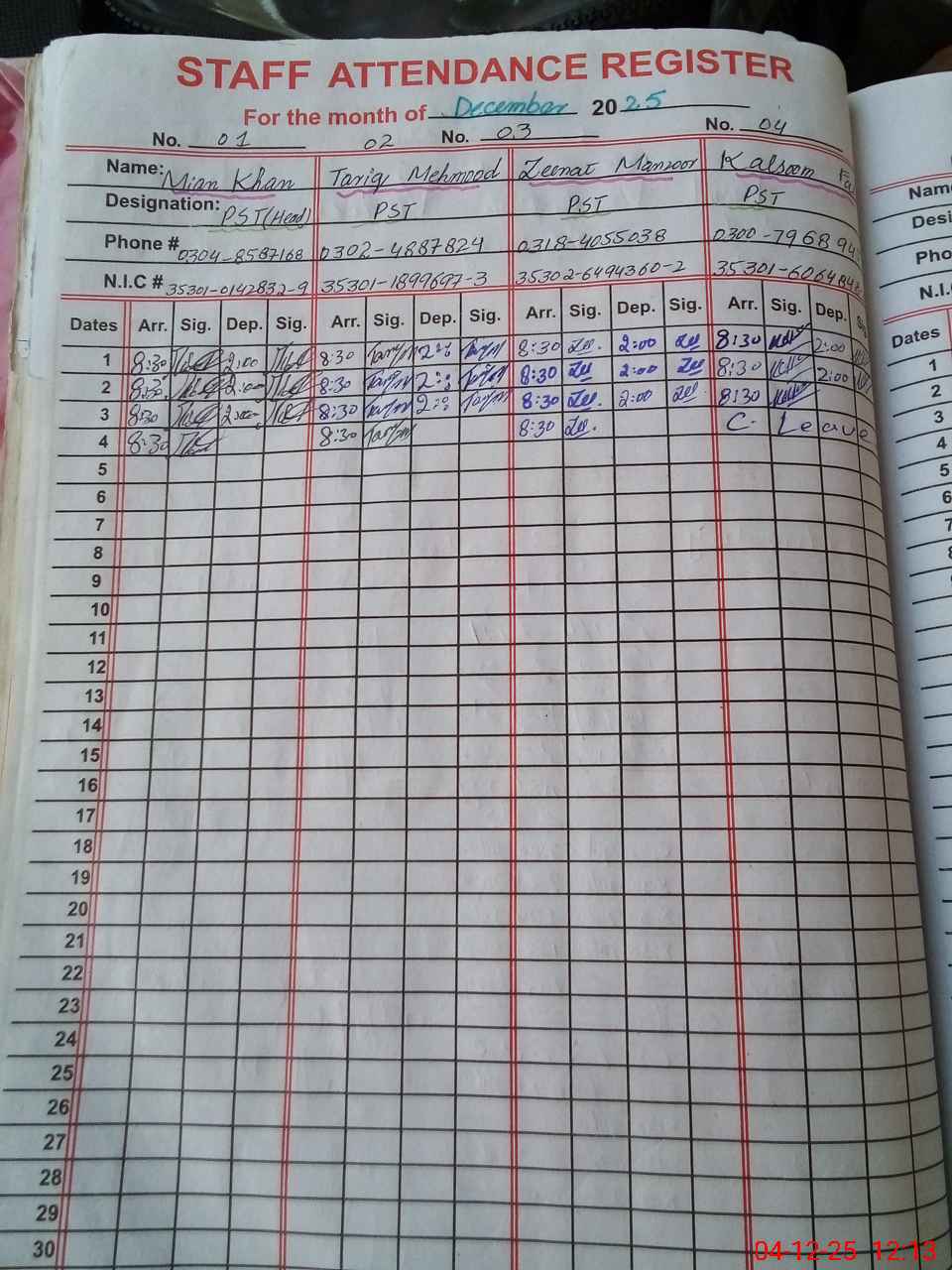 | CNIC | Full Name | Designation | R/C | Absence During Last Calender Month |