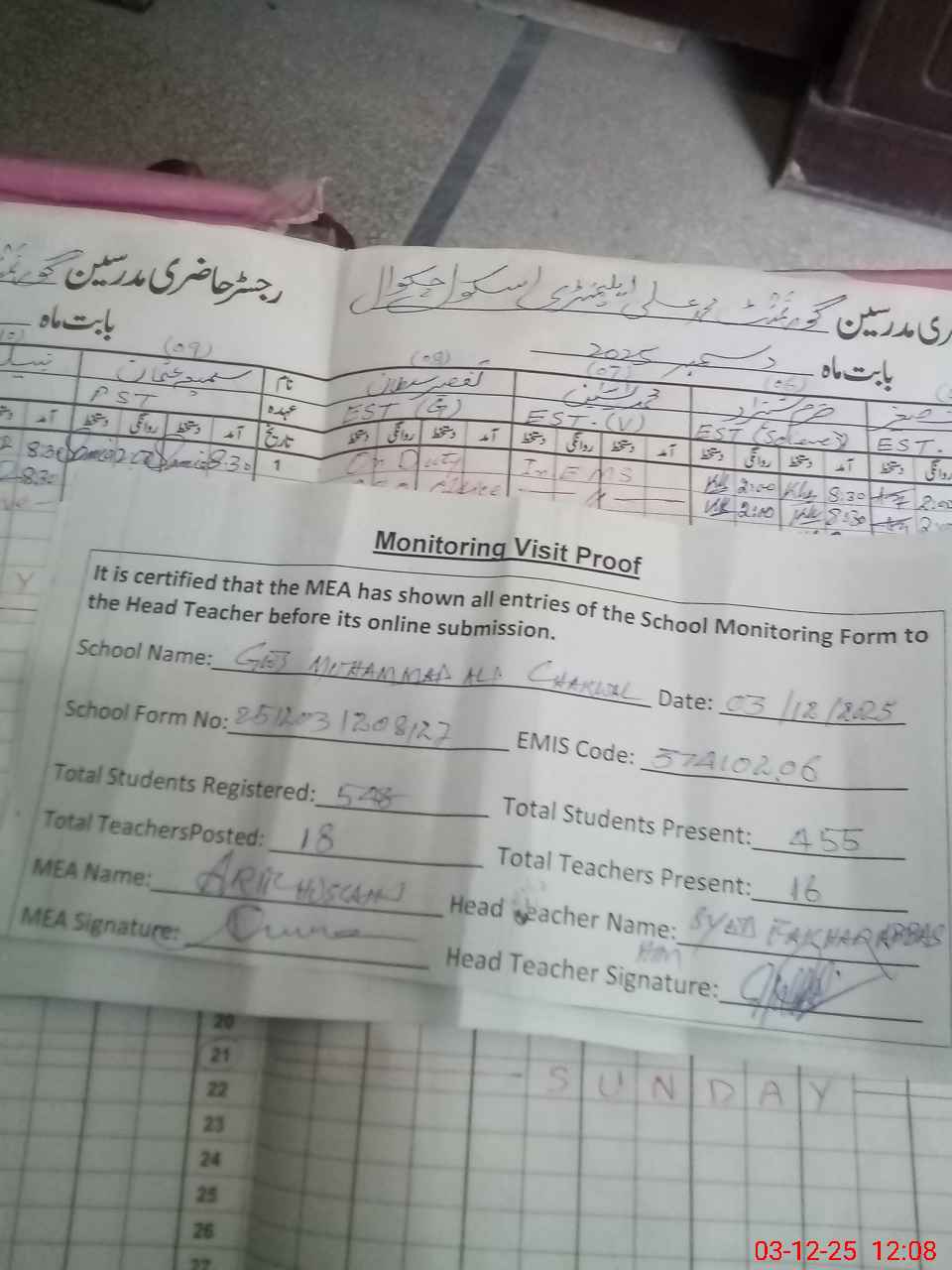 | Attendance Register | Head Teacher | MEA with School | Visit Proof |