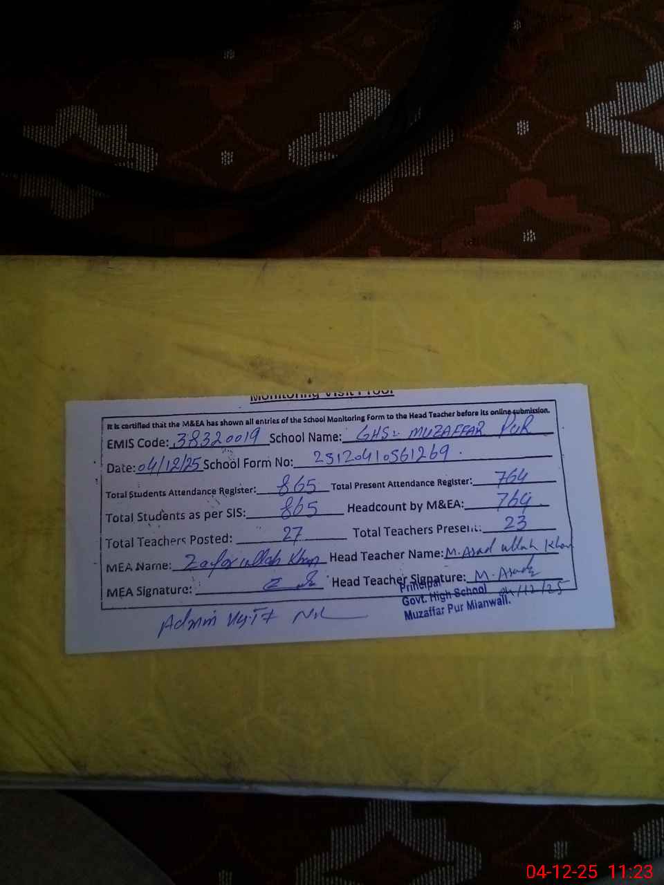 | EMIS Code: 38320019 | Name of School: GHS MUZAFFAR PUR | |||