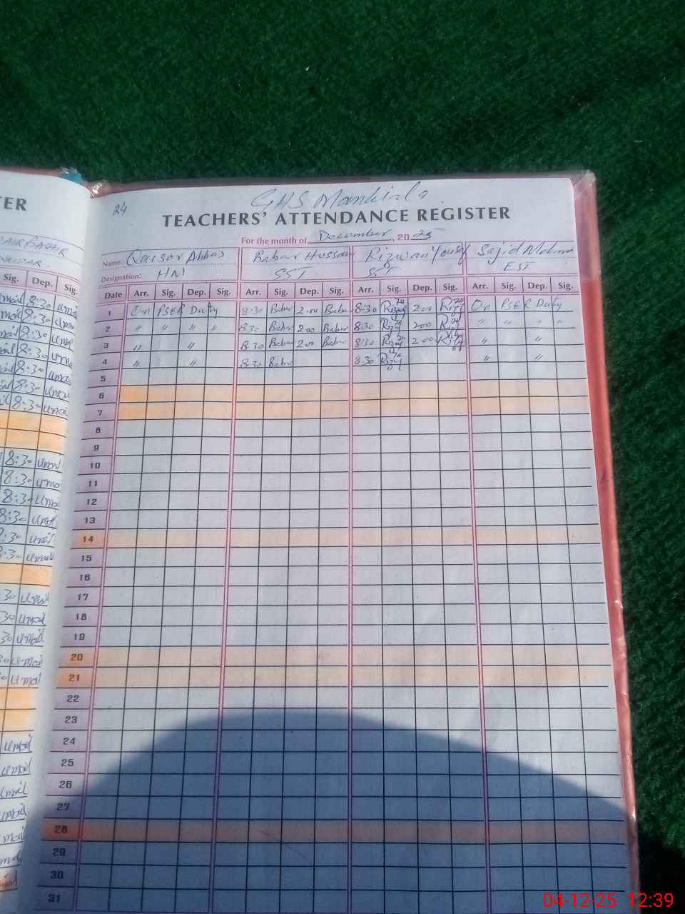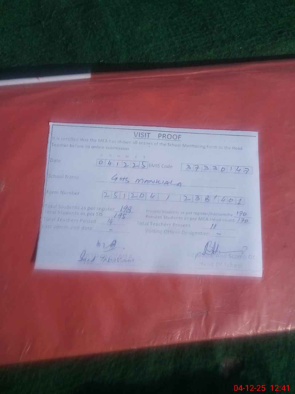 | Attendance Register | Head Teacher | MEA with School | Visit Proof |