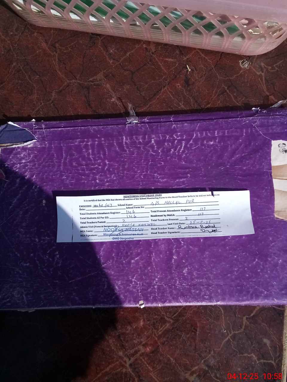 | Attendance Register | Head Teacher | MEA with School | Visit Proof |