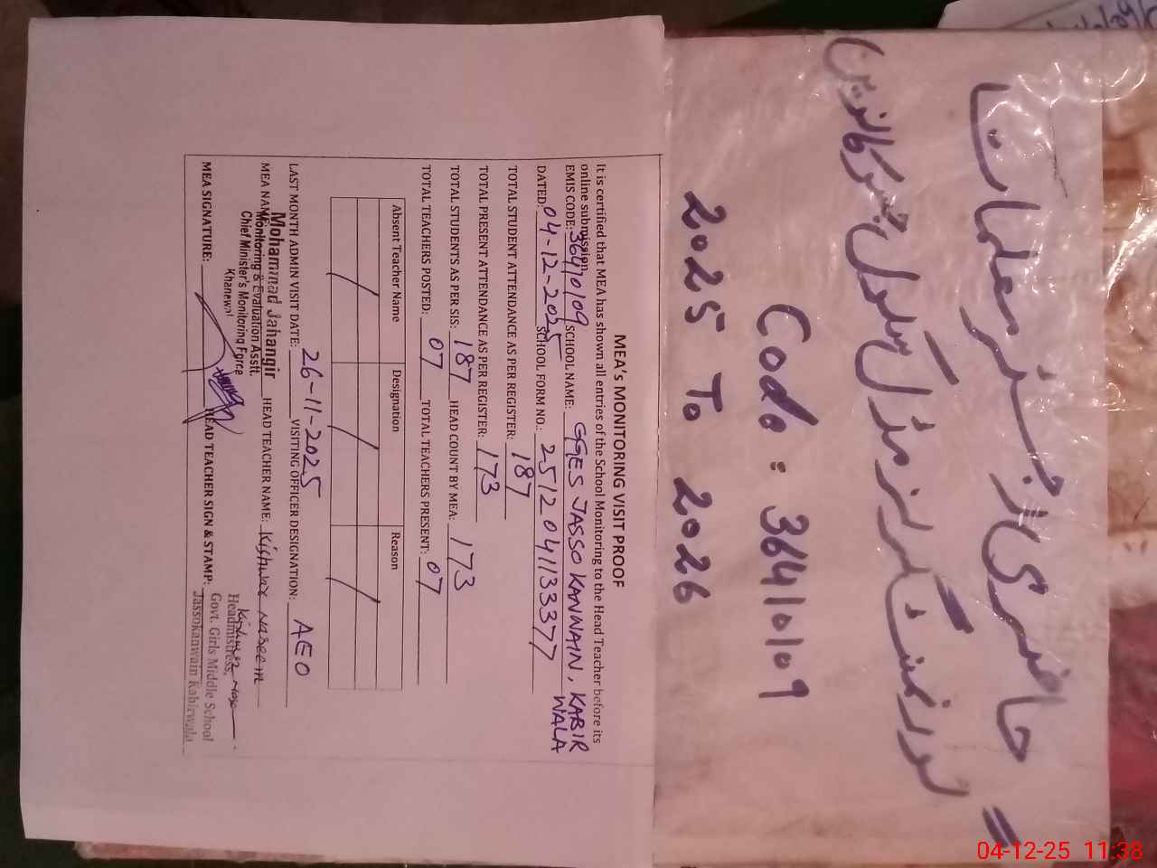 | Attendance Register | Head Teacher | MEA with School | Visit Proof |
