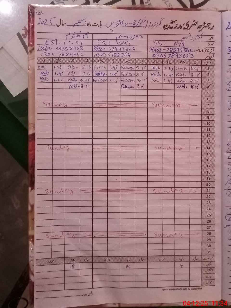 | CNIC | Full Name | Designation | R/C | Absence During Last Calender Month |