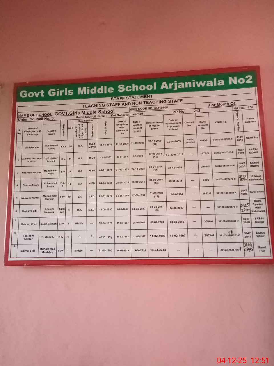 | EMIS Code: 36410108 | Name of School: GGES ARJANI WALA NO. 2 | |||