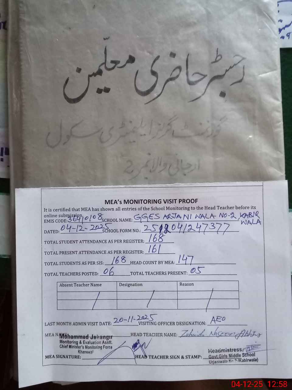 | Attendance Register | Head Teacher | MEA with School | Visit Proof |